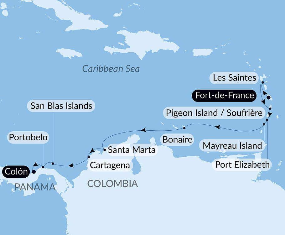 Iles Des Saintes or Les Saintes is formed by nine unspoiled islands, two of which are inhabited. Forest-coated island cones rise from the turquoise waters and crystalline tropical beaches line the shores of these heavenly Caribbean islands. Ships will anchor offshore and tenders will be provided to the island, Terre de Haut.