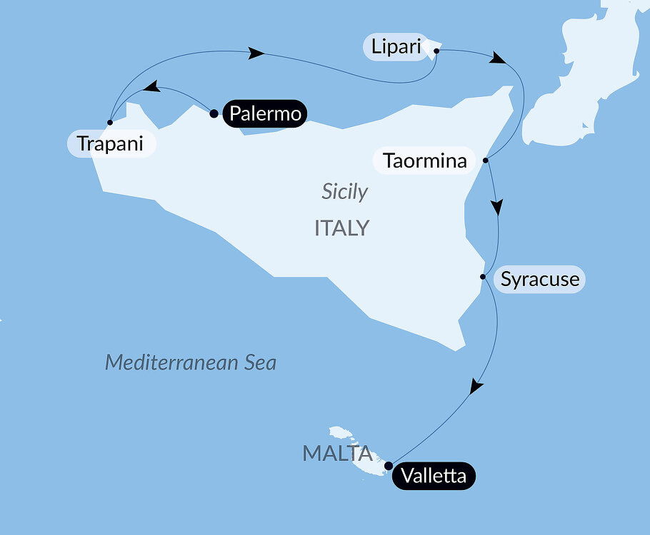 Perched on a low-lying, palazzi-dotted promontory on Sicily's west coast, Trapani reveals a hint of its medieval past in its historic core's maze of narrow streets. Surrounded by glowing turquoise waters and rugged coastline, it is the gateway to western Sicily's ruins. Ships will dock at Porto di Trapani.