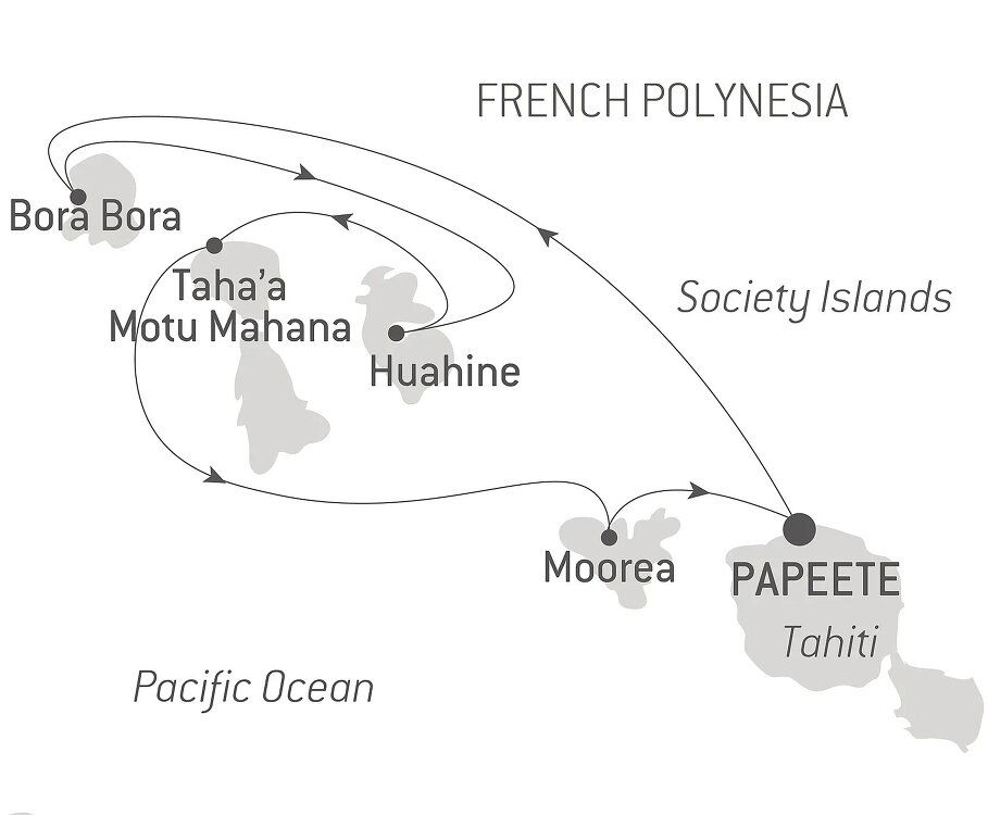 The island's unique geography makes Moorea one of French Polynesia's most breathtaking islands. Eight mountain peaks carpeted in lush vegetation rise from a translucent lagoon and two tranquil bays. Ships will anchor offshore and tenders will be provided to the shore.