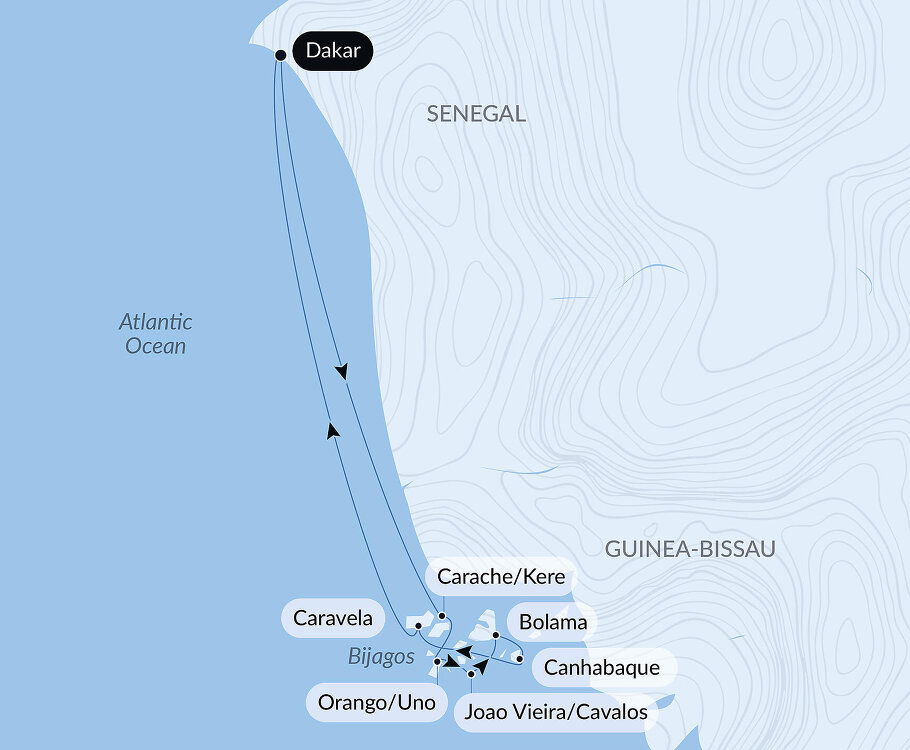 Exploring the islands offers opportunities for eco-tourism and adventure. Visit Orango Island to see the rare saltwater hippos or take a guided tour to learn about the local customs and traditions. The archipelago's pristine beaches and crystal-clear waters are perfect for relaxing, swimming, and snorkelling, making the Bijagos a remarkable and tranquil destination for cruise travellers.
