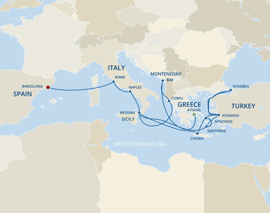 The lush and verdant island of Corfu lies in the Ionian Sea, midway between Greece and Italy. It is an island of sparkling beaches, mountains splashed with wildflowers, and historical, perched fortresses. Ships will dock at the town of Corfu.