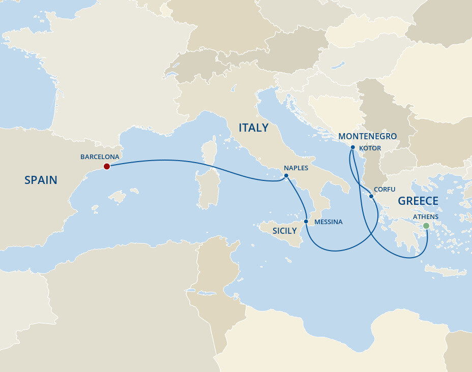 The lush and verdant island of Corfu lies in the Ionian Sea, midway between Greece and Italy. It is an island of sparkling beaches, mountains splashed with wildflowers, and historical, perched fortresses. Ships will dock at the town of Corfu.