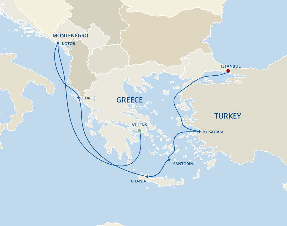 The lush and verdant island of Corfu lies in the Ionian Sea, midway between Greece and Italy. It is an island of sparkling beaches, mountains splashed with wildflowers, and historical, perched fortresses. Ships will dock at the town of Corfu.