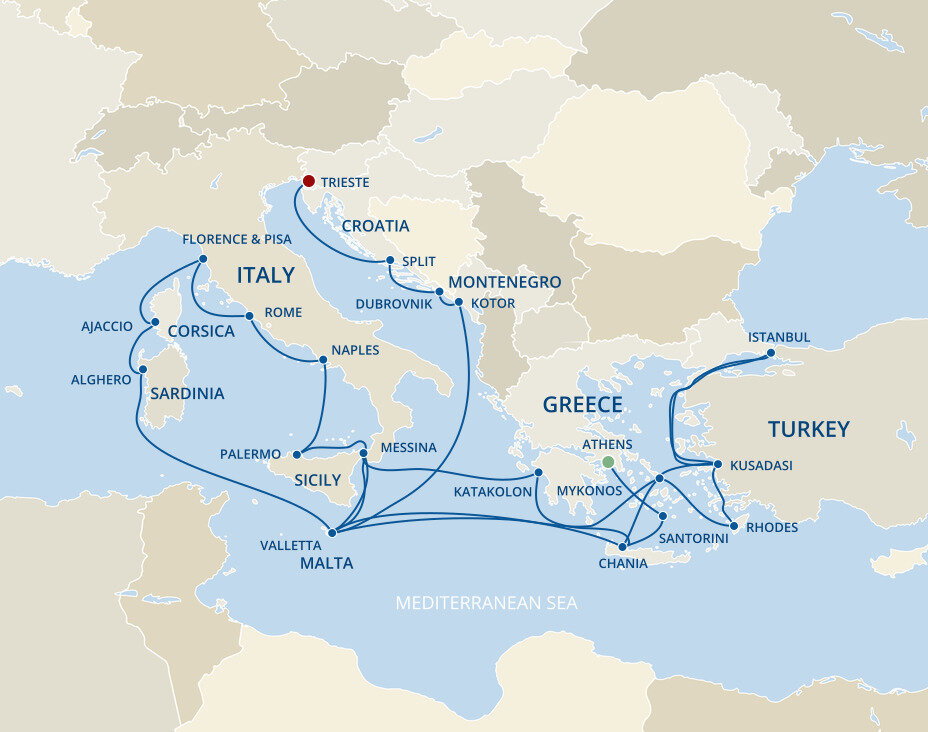 Your ship will dock at the Trieste Cruise Terminal, located right in the heart of the city. This makes it easy to explore Trieste and visit key attractions like Piazza Unità d'Italia, the Roman Theatre, and Miramare Castle which are easily accessible by foot or a short bus ride.