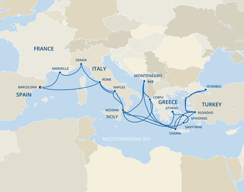 Your cruise finishes today in Barcelona, a captivating city on Spain's northeastern coast. If you're extending your stay in the city, start with a visit to La Sagrada Família, Antoni Gaudí's masterpiece, then wander through the narrow, historic streets of the Gothic Quarter.