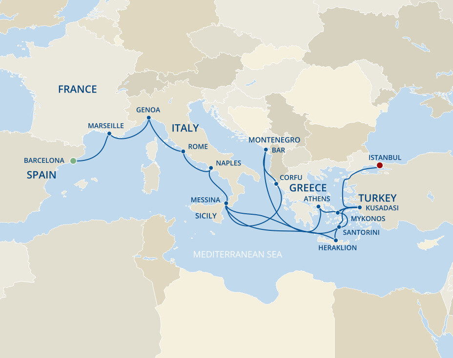 The lush and verdant island of Corfu lies in the Ionian Sea, midway between Greece and Italy. It is an island of sparkling beaches, mountains splashed with wildflowers, and historical, perched fortresses. Ships will dock at the town of Corfu.