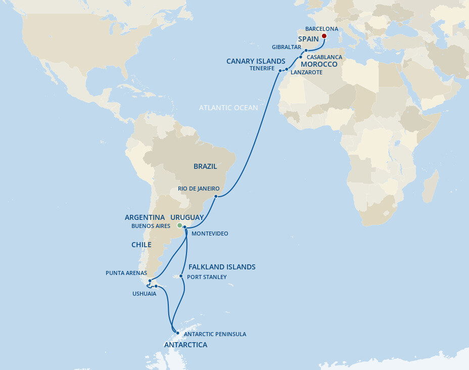 Located at the southernmost end of South America, Ushuaia is is often called a doorway to Antarctica. The town boasts incredible natural beauty through its national parks like the Tierra del Fuego National Park with cultural institutions like the Museo del Fin del Mundo, or the End of the World Museum. Ships will dock at this port.