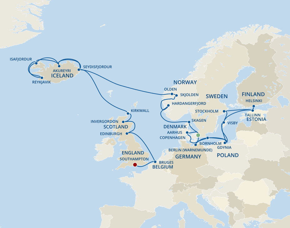 The iconic Little Mermaid statue sits serenely by the waterfront, while Tivoli Gardens, one of the world’s oldest amusement parks, offers charming rides and lush gardens in the heart of the city. Your ship will dock at the Port of Copenhagen, which is a 30 minute drive to Copenhagen Airport and a 15 minute drive into the city centre.