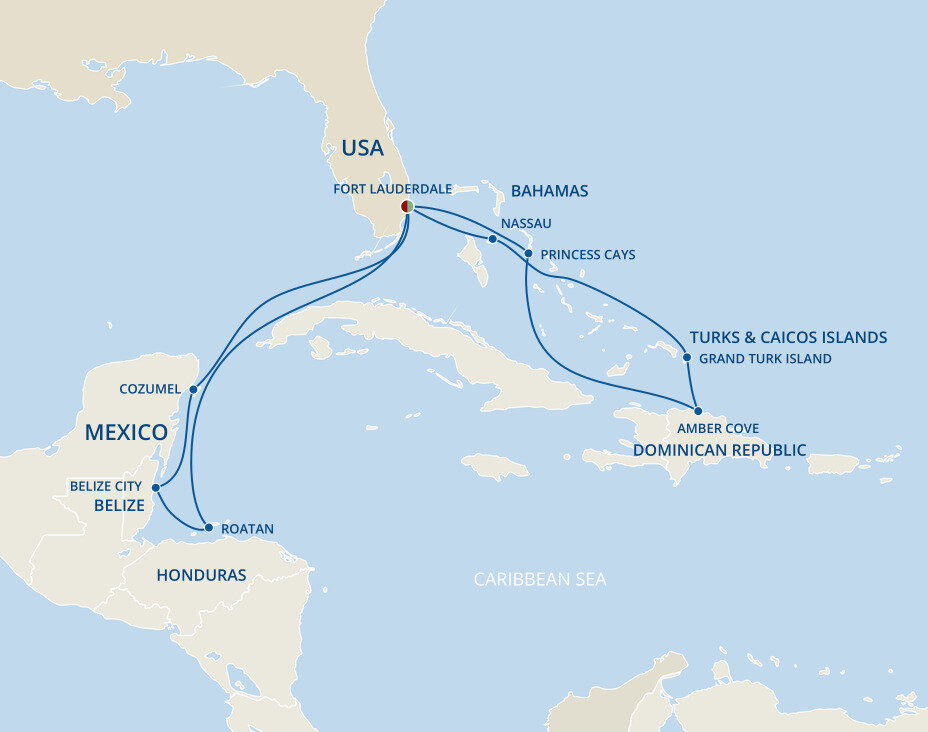 Princess Cays is an exclusive port of call to Princess cruises. This private resort is situated on more than 40 acres and features over a half-mile of white-sand shoreline, all at the southern tip of Eleuthera island. Ships will anchor offshore and tenders are provided to the shore.
