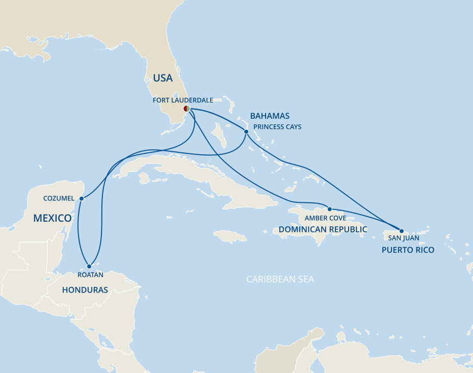 Princess Cays is an exclusive port of call to Princess cruises. This private resort is situated on more than 40 acres and features over a half-mile of white-sand shoreline, all at the southern tip of Eleuthera island. Ships will anchor offshore and tenders are provided to the shore.