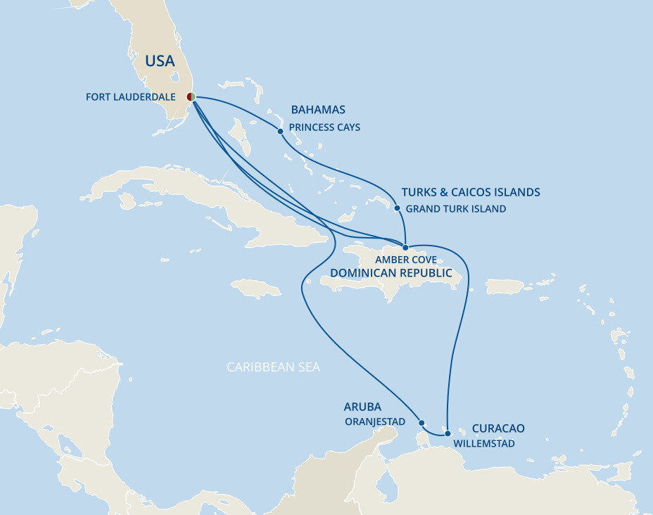 Princess Cays is an exclusive port of call to Princess cruises. This private resort is situated on more than 40 acres and features over a half-mile of white-sand shoreline, all at the southern tip of Eleuthera island. Ships will anchor offshore and tenders are provided to the shore.
