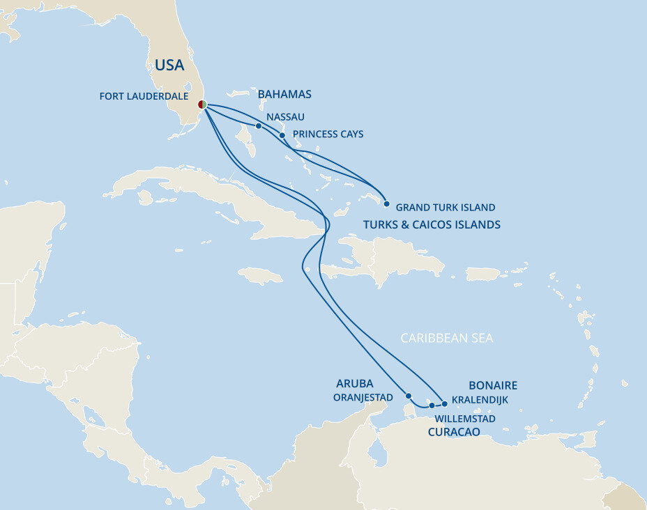 Beach masterpieces of silky white sand and sparkling water shifting from turquoise to royal blue welcome you to idyllic Grand Turk. The capital of the Turks and Caicos Islands is a small island bursting with turn-of-the-century charm, retaining the look and feel of the Caribbean 40 years ago. Ships will dock at the Grand Turk Cruise Centre.