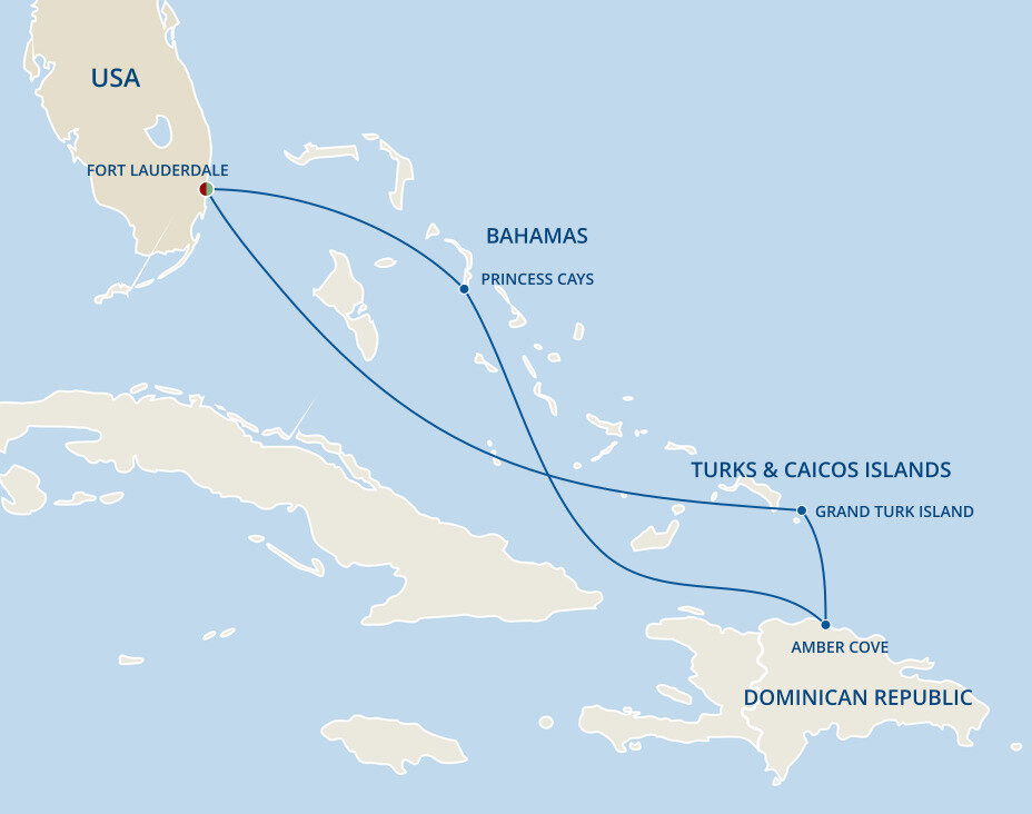 Princess Cays is an exclusive port of call to Princess cruises. This private resort is situated on more than 40 acres and features over a half-mile of white-sand shoreline, all at the southern tip of Eleuthera island. Ships will anchor offshore and tenders are provided to the shore.