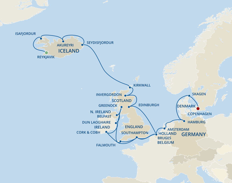 Iceland’s Capital of the North is the gateway to a thrilling land of roaring waterfalls, soaring volcanoes and glorious wildlife. Situated at the head of Eyjafjordur, Iceland's longest fjord and with a backdrop of dramatic snow-covered mountains, Akureyri is Iceland's second largest city. Ships will dock at the pier.