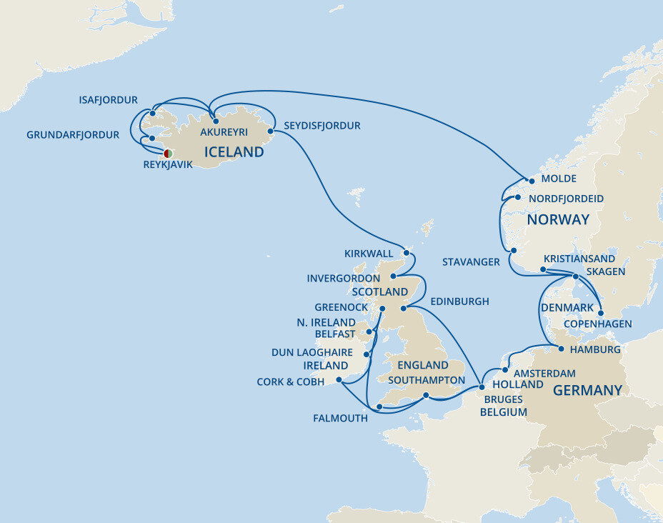 Iceland’s Capital of the North is the gateway to a thrilling land of roaring waterfalls, soaring volcanoes and glorious wildlife. Situated at the head of Eyjafjordur, Iceland's longest fjord and with a backdrop of dramatic snow-covered mountains, Akureyri is Iceland's second largest city. Ships will dock at the pier.