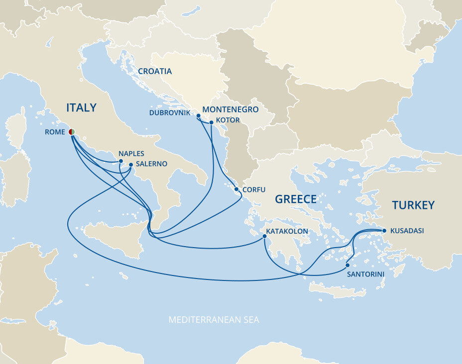 The lush and verdant island of Corfu lies in the Ionian Sea, midway between Greece and Italy. It is an island of sparkling beaches, mountains splashed with wildflowers, and historical, perched fortresses. Ships will dock at the town of Corfu.
