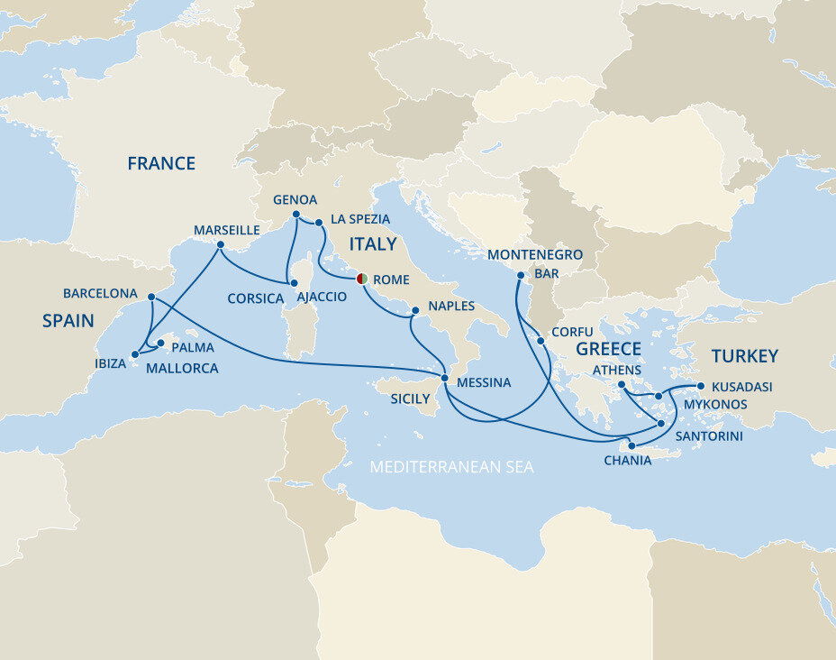 Located on the west coast of Corsica, Ajaccio is surrounded by green-hued mountains, with shady palm fringed squares and pleasure boats bobbing in the bay. The city is best known as the birthplace of Napoleon Bonaparte and his legacy dominates the city in its statues and street names. Ships will dock at Gare Maritime d’Ajaccio.