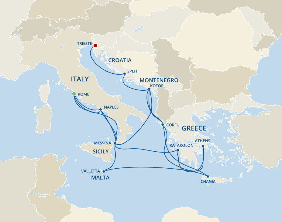 Your ship will dock at the Trieste Cruise Terminal, located right in the heart of the city. This makes it easy to explore Trieste and visit key attractions like Piazza Unità d'Italia, the Roman Theatre, and Miramare Castle which are easily accessible by foot or a short bus ride.