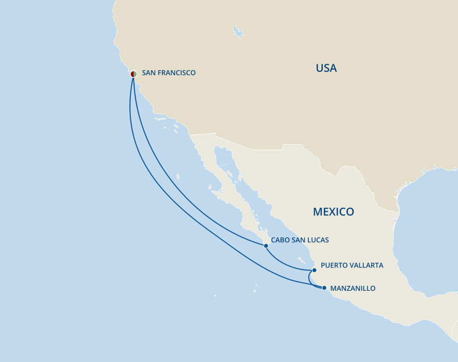 Cabo San Lucas is the sunny resort town on the tip of Mexico’s Baja California. This colourful small town is known for its excellent big-game fishing, great diving spots and challenging surf waves. Ships will anchor offshore in Cabo San Lucas bay and tender guests to shore.