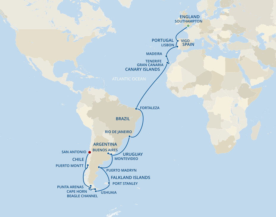 Located at the southernmost end of South America, Ushuaia is is often called a doorway to Antarctica. The town boasts incredible natural beauty through its national parks like the Tierra del Fuego National Park with cultural institutions like the Museo del Fin del Mundo, or the End of the World Museum. Ships will dock at this port.