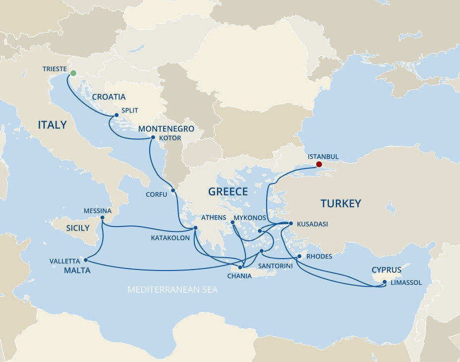 The vibrant city of Limassol is located on Akrotiri Bay in the shadow of the Troodos mountains. Its the jumping off point to explore the ancient riches of Cyprus. See ruins, majestic mountains and scenery, stunning beaches, and vast groves of lemons, oranges and olives. Ships will dock at the cruise terminal.