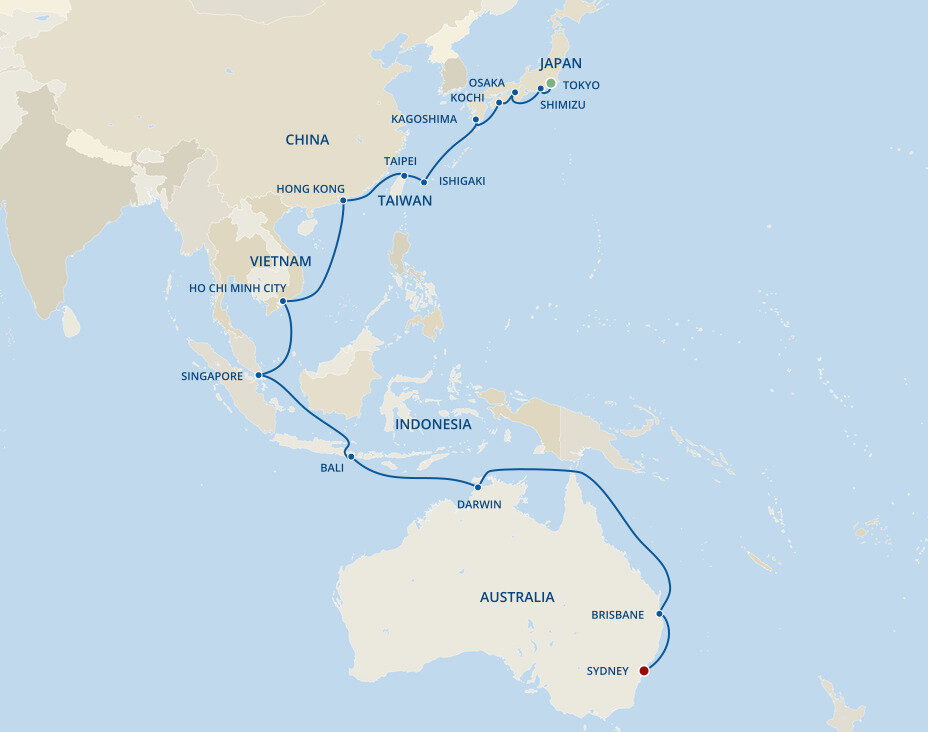 Osaka's Tempozan Cruise Terminal is located about 15 km (9 miles) from Osaka city center, a 30-minute drive. Kyoto is roughly 60 km (37 miles) away.