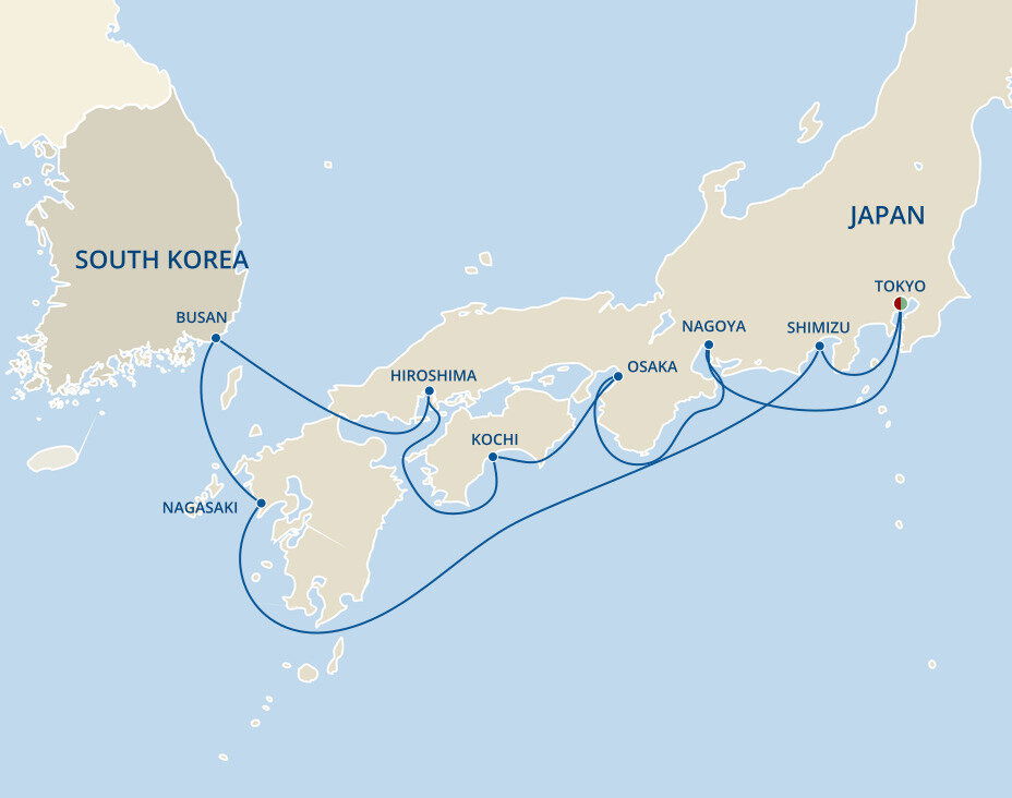 Osaka's Tempozan Cruise Terminal is located about 15 km (9 miles) from Osaka city center, a 30-minute drive. Kyoto is roughly 60 km (37 miles) away.