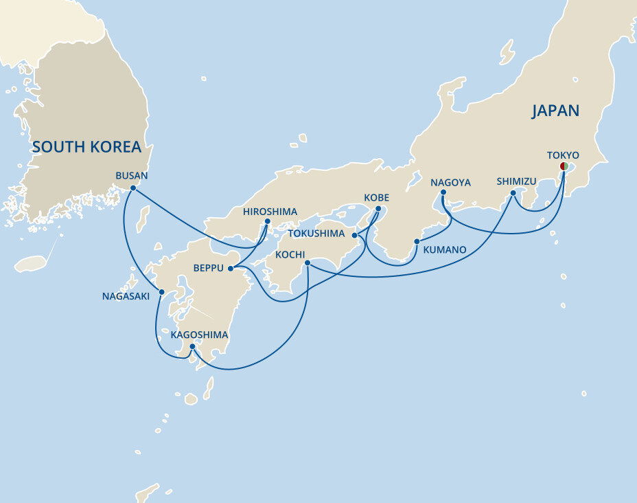 Overlooking Beppu Bay to its east and dramatic mountain peaks to the west, Beppu is blanketed with misty turquoise waters and elegant Japanese foliage. Its main attraction is the 'Hells of Beppu,' a collection of 8 onsen, or hot springs, some of which feature geysers and colourful waters ranging from white to copper to sapphire. Ships will dock at the port of Beppu.