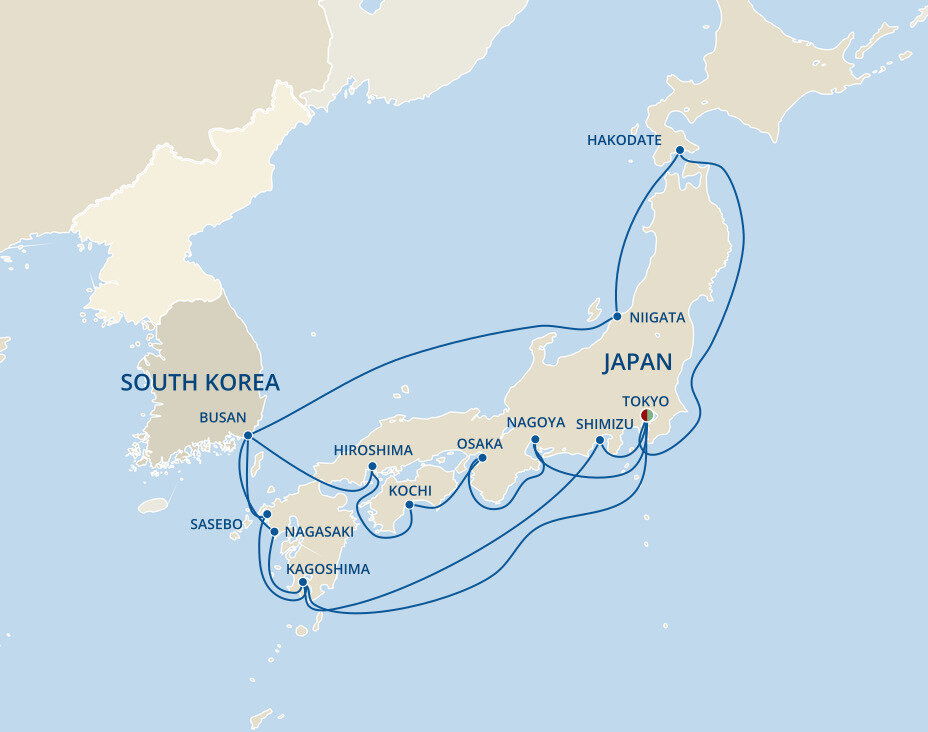 Osaka's Tempozan Cruise Terminal is located about 15 km (9 miles) from Osaka city center, a 30-minute drive. Kyoto is roughly 60 km (37 miles) away.