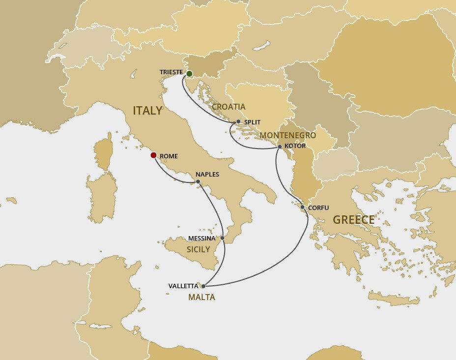 The lush and verdant island of Corfu lies in the Ionian Sea, midway between Greece and Italy. It is an island of sparkling beaches, mountains splashed with wildflowers, and historical, perched fortresses. Ships will dock at the town of Corfu.