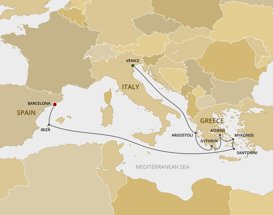 The modern and cosmopolitan town of Argostoli, stands on the far end of a natural bay surrounded by mountains and verdant forests. It’s a slower life here, especially since the town had to rebuild itself from the ground up following a 1953 earthquake that devastated the area. Ships will dock or anchor at this port.