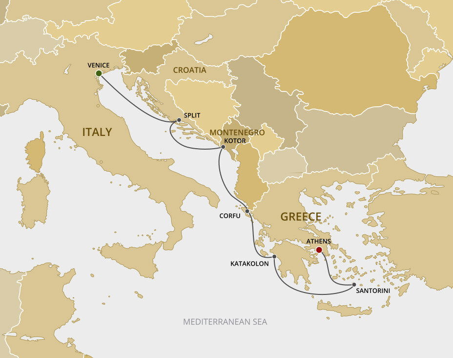 The lush and verdant island of Corfu lies in the Ionian Sea, midway between Greece and Italy. It is an island of sparkling beaches, mountains splashed with wildflowers, and historical, perched fortresses. Ships will dock at the town of Corfu.