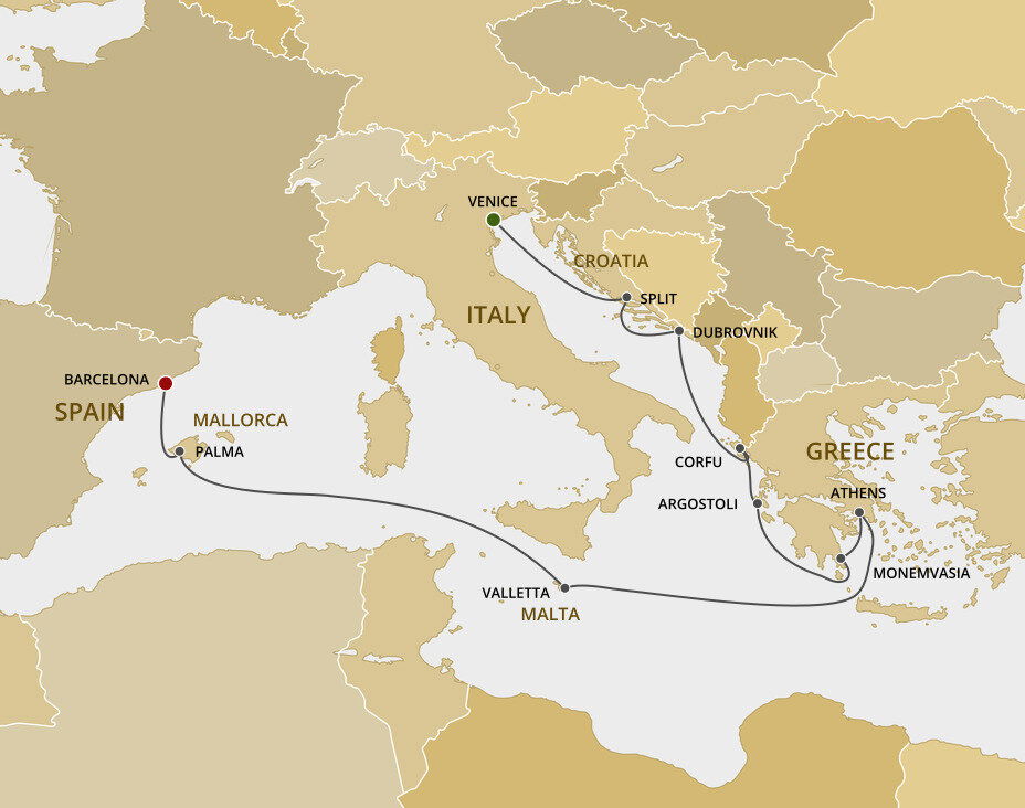 The lush and verdant island of Corfu lies in the Ionian Sea, midway between Greece and Italy. It is an island of sparkling beaches, mountains splashed with wildflowers, and historical, perched fortresses. Ships will dock at the town of Corfu.