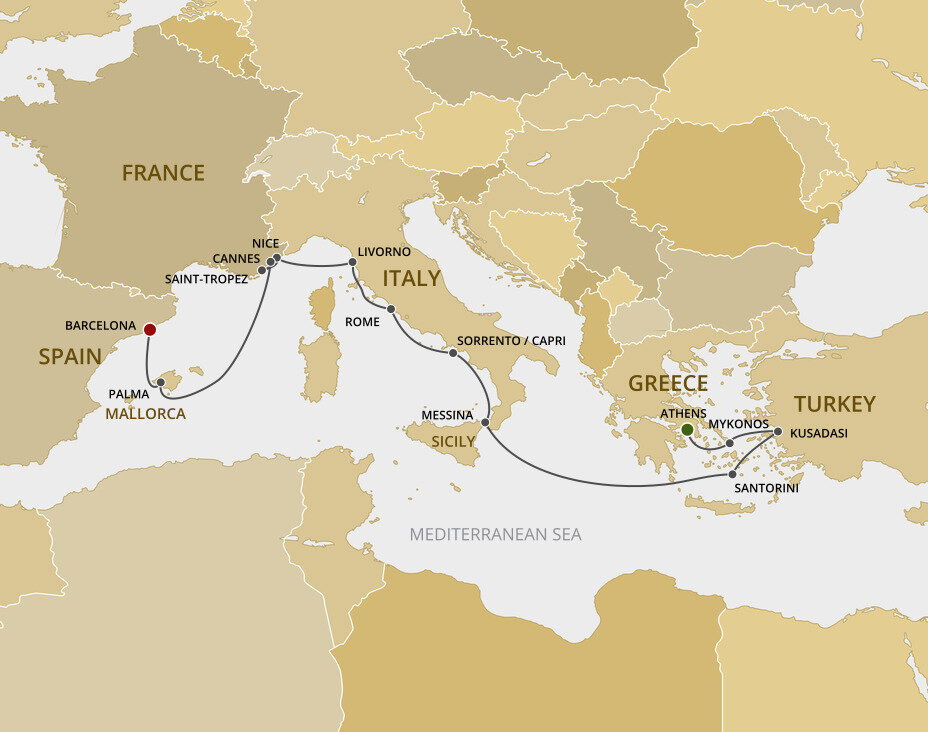 Sorrento's colourful, sun-faded facades cascade down from green hills and cliffs to the Bay of Naples. Looking out from Sorrento, in the Gulf of Naples, is the isle of Capri. Well known for its sparkling Blue Grotto and as the playground of the rich and famous. Ships will anchor offshore and tenders will be provided to the marina.