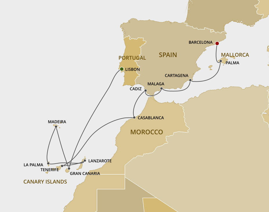‘La Isla Bonita,’ La Palma is one of the smaller of the Canary Islands. Its capital, Santa Cruz de la Palma, is a beautiful colonial-style city set on a picturesque harbour. The island’s landscape is one of black sand beaches, mountainous terrain and rich plant life. Ships will dock at the port of Santa Cruz de la Palma.