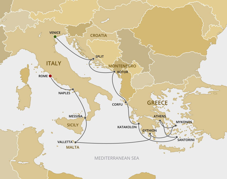 The lush and verdant island of Corfu lies in the Ionian Sea, midway between Greece and Italy. It is an island of sparkling beaches, mountains splashed with wildflowers, and historical, perched fortresses. Ships will dock at the town of Corfu.
