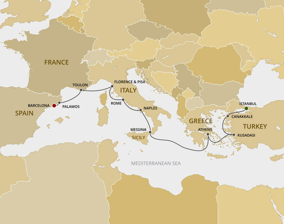 Your cruise finishes today in Barcelona, a captivating city on Spain's northeastern coast. If you're extending your stay in the city, start with a visit to La Sagrada Família, Antoni Gaudí's masterpiece, then wander through the narrow, historic streets of the Gothic Quarter.