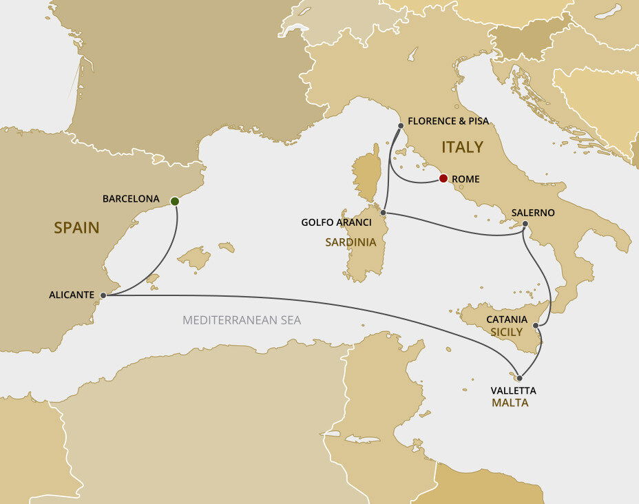 Between the Mediterranean Sea and Mount Etna lies the picturesque city of Catania. Destroyed by an earthquake in the 17th century, Catania has been beautifully restored and offers ancient churches, castles and amphitheaters, lush gardens and lovely palazzos to explore. Ships will dock at the cruise terminal.