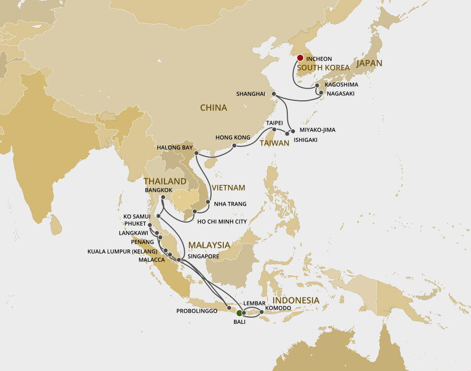 Incheon serves as the port of call and gateway to the city of Seoul, the capital of South Korea, and is just over 40km/24mi away (just over 30 minutes away by car).