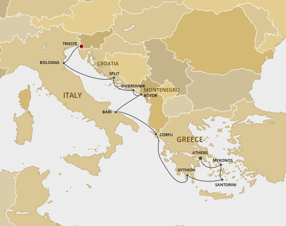 The lush and verdant island of Corfu lies in the Ionian Sea, midway between Greece and Italy. It is an island of sparkling beaches, mountains splashed with wildflowers, and historical, perched fortresses. Ships will dock at the town of Corfu.