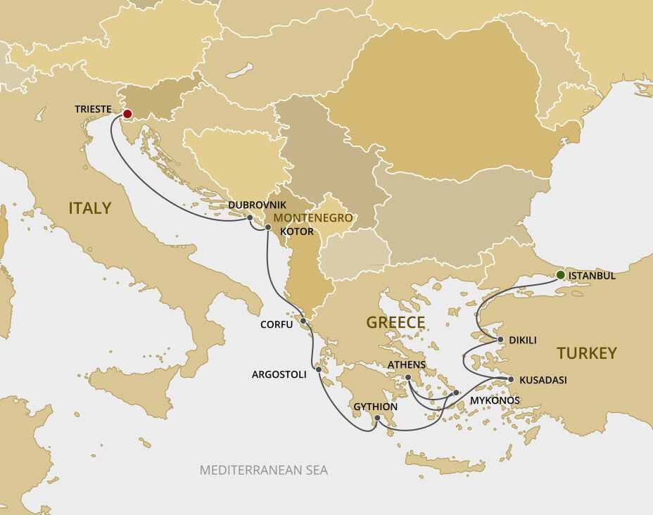 The lush and verdant island of Corfu lies in the Ionian Sea, midway between Greece and Italy. It is an island of sparkling beaches, mountains splashed with wildflowers, and historical, perched fortresses. Ships will dock at the town of Corfu.