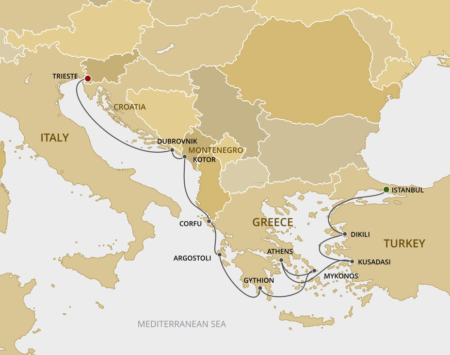 The lush and verdant island of Corfu lies in the Ionian Sea, midway between Greece and Italy. It is an island of sparkling beaches, mountains splashed with wildflowers, and historical, perched fortresses. Ships will dock at the town of Corfu.