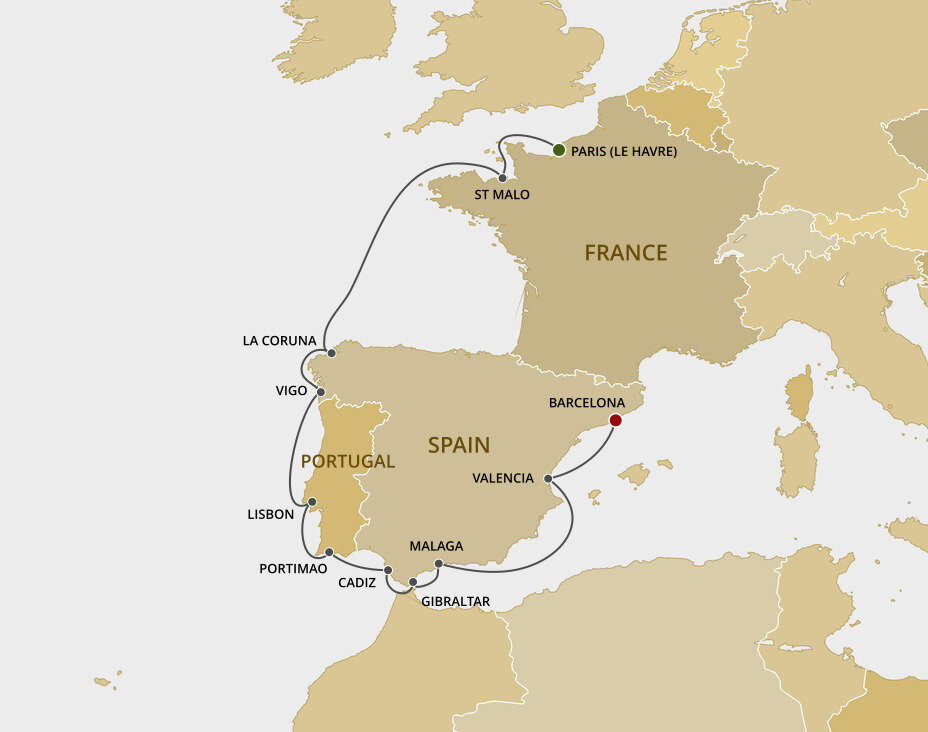 Your cruise finishes today in Barcelona, a captivating city on Spain's northeastern coast. If you're extending your stay in the city, start with a visit to La Sagrada Família, Antoni Gaudí's masterpiece, then wander through the narrow, historic streets of the Gothic Quarter.