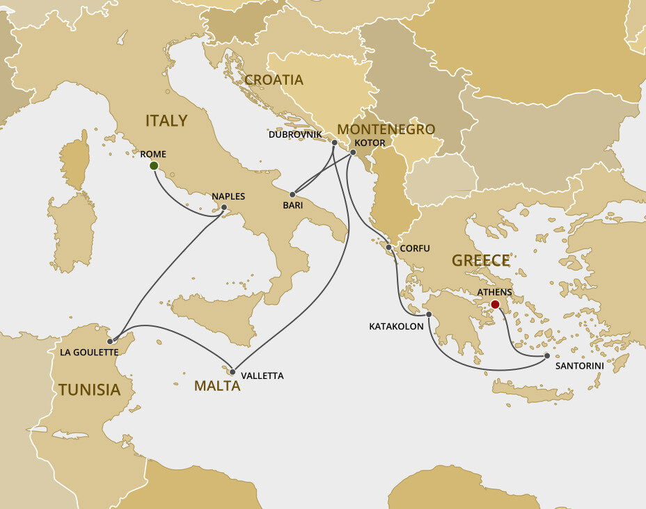The lush and verdant island of Corfu lies in the Ionian Sea, midway between Greece and Italy. It is an island of sparkling beaches, mountains splashed with wildflowers, and historical, perched fortresses. Ships will dock at the town of Corfu.