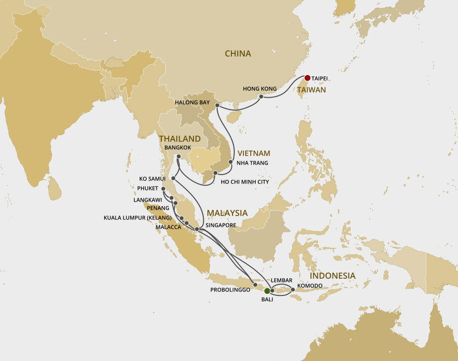 Malaysia’s dynamic capital is a melting pot of skyscrapers, Islamic architecture and British Colonial buildings offering a futuristic cityscape with an enduring nod to yesteryear. Home to some of Asia’s most opulent shopping malls, Kuala Lumpur’s skyline is dominated by the famous Petronas and Menara Kuala Lumpur Towers. Ships will dock in Port Klang.