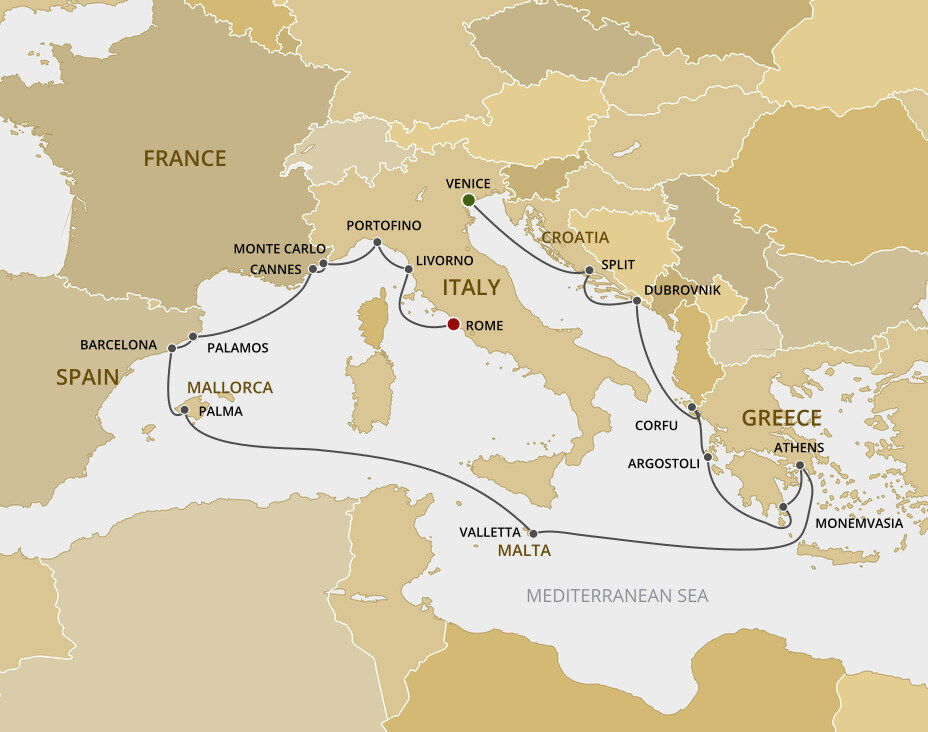 The lush and verdant island of Corfu lies in the Ionian Sea, midway between Greece and Italy. It is an island of sparkling beaches, mountains splashed with wildflowers, and historical, perched fortresses. Ships will dock at the town of Corfu.