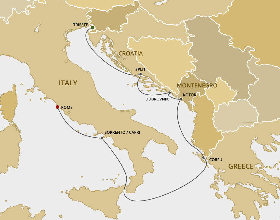 The lush and verdant island of Corfu lies in the Ionian Sea, midway between Greece and Italy. It is an island of sparkling beaches, mountains splashed with wildflowers, and historical, perched fortresses. Ships will dock at the town of Corfu.