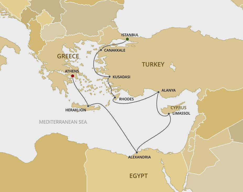 The vibrant city of Limassol is located on Akrotiri Bay in the shadow of the Troodos mountains. Its the jumping off point to explore the ancient riches of Cyprus. See ruins, majestic mountains and scenery, stunning beaches, and vast groves of lemons, oranges and olives. Ships will dock at the cruise terminal.