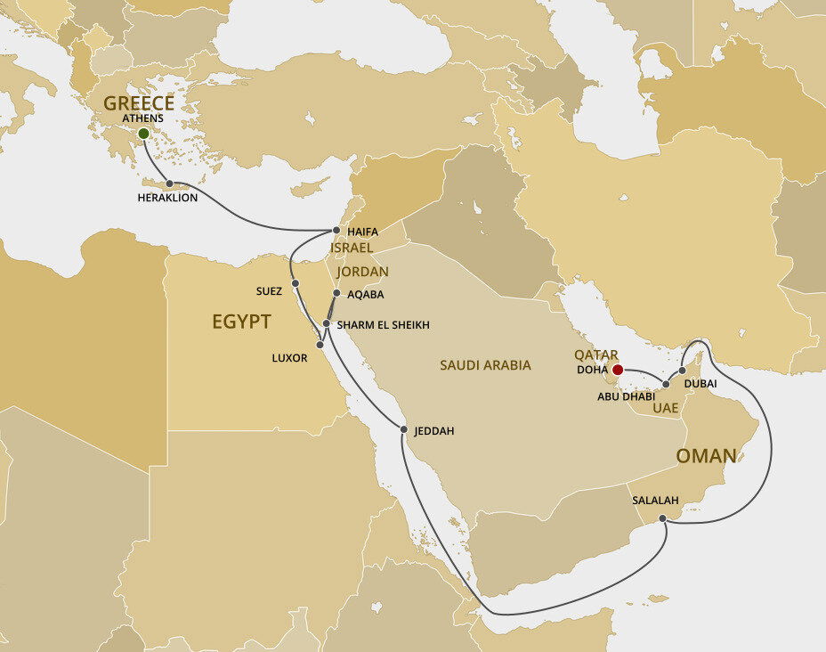 Known as the shining jewel of Qatar, Doha sits on the east coast lapped by the warm waters of the Persian Gulf. It is an ancient city in the midst of a modern renaissance as evidenced by stunning new buildings, resorts, shopping malls, and sporting venues emerging from the desert landscape like a futuristic oasis. Ships will dock at Doha Port.