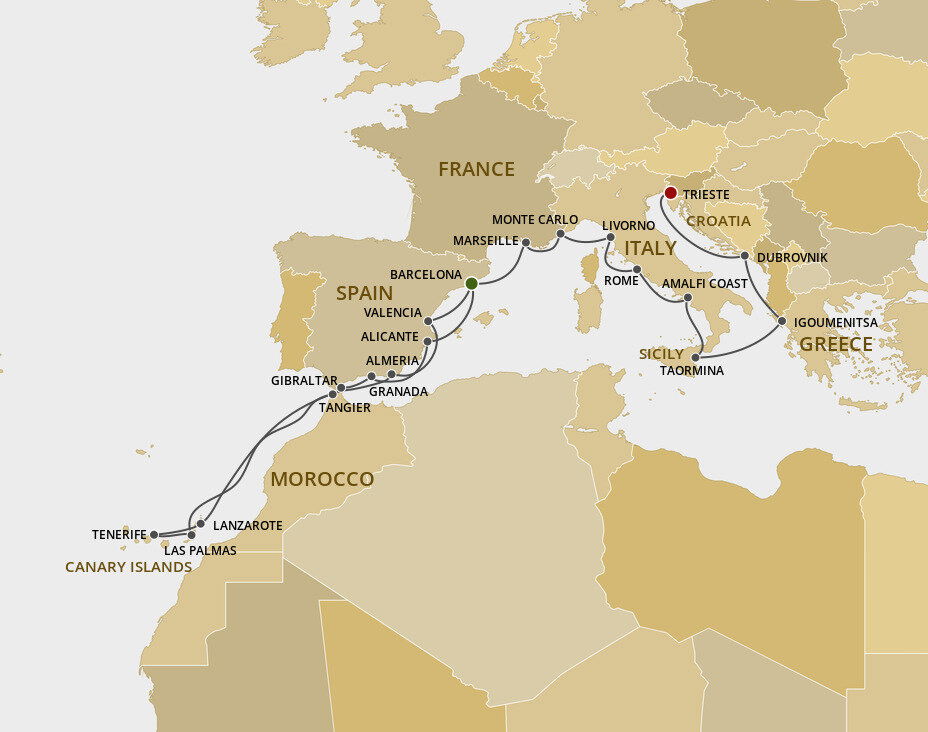Situated at the foothills of the Sierra de Gador mountain range, the Spanish coastal city of Almeria is renowned for its wonderful climate. The sun shines for more than 320 days a year and the city has a coastline of preserved beaches with an interior characterised by its typical desert ecosystem. Ships will dock at the Muelle de Levante.